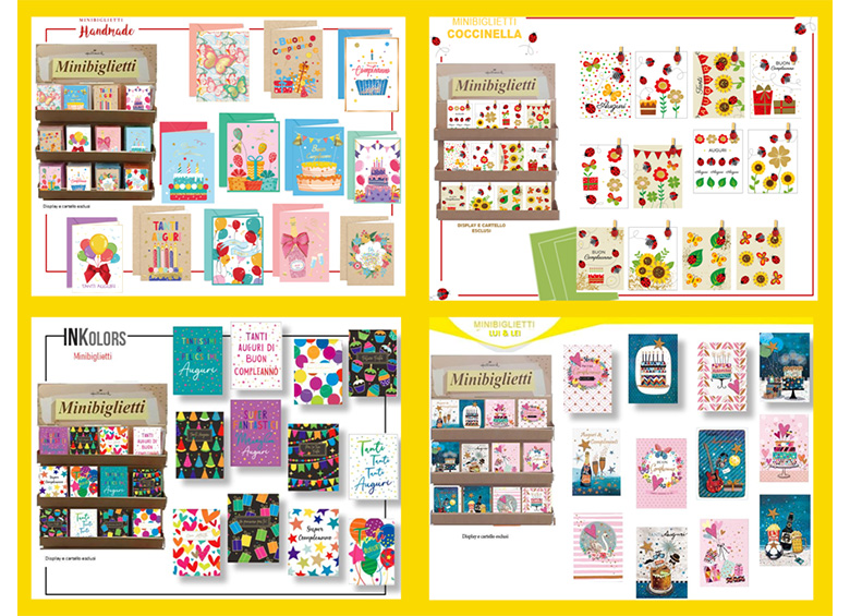 La nostra proposta è ampia e diversificata ed include minibiglietti con busta, impreziositi da diverse rifiniture e varie applicazioni. Adatti per ogni ricorrenza e per il loro formato (7×10 cm), sono indicati per accompagnare il regalo oppure per completare un mazzo di fiori. Per ogni assortimento è prevista la possibilità di un espositore da banco per una appropriata esposizione.